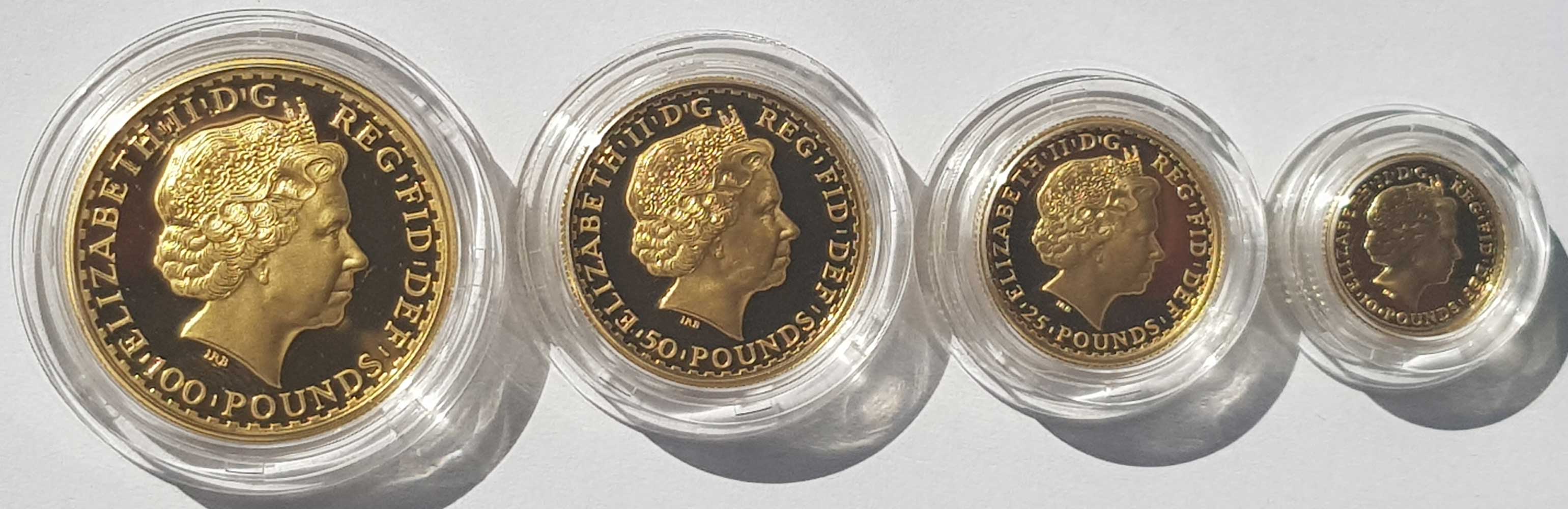 The set contains a gold proof five pounds (£5), two pounds (£2), sovereign and half sovereign. Benedetto Pistrucci's famous portrayal of St. George slaying the dragon is depicted on each of the reverses.