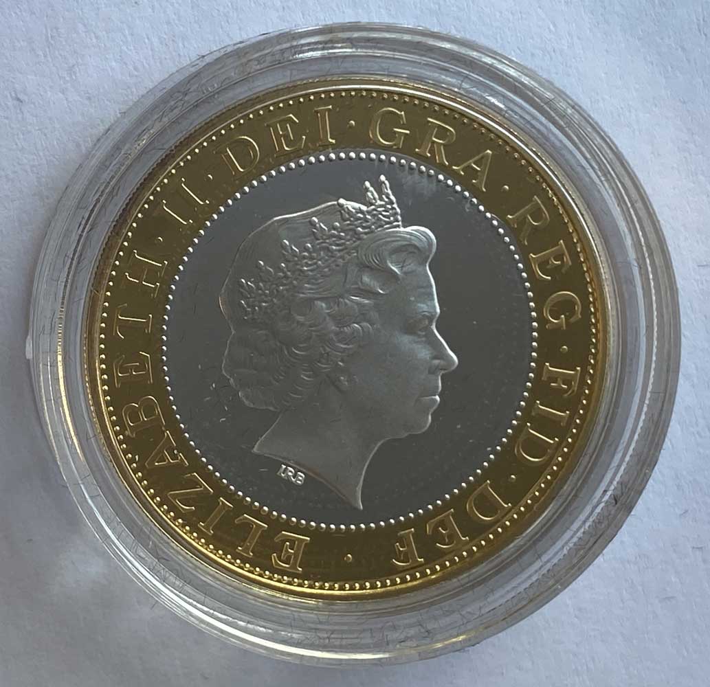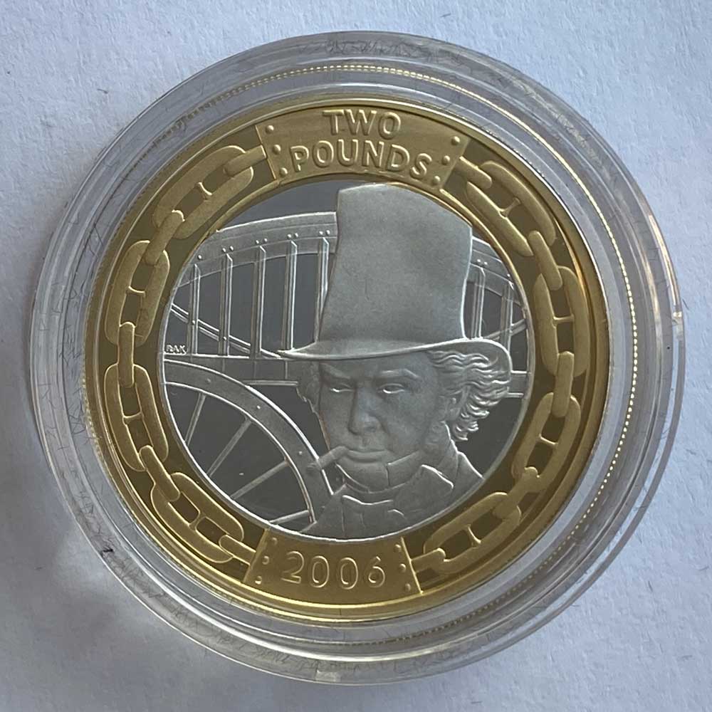 Sterling Silver .925 Weight: 12 g Diameter: 28.40 millimeters The reverse designed by Rod Kelly is a picture of a section of the roof of Paddington Station with "Brunel" below and the date "2006" and denomination "Two Pounds", with the edge inscription "So Many Irons In The Fire". The obverse features Ian Rank Broadley's mature, reflective portrait of Her Majesty Queen Elizabeth II.Summary