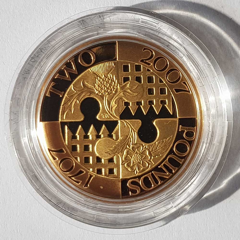 The 2007 Act of Union gold proof two pounds piece commemorates the tercentenary of the Act of Union between England and Scotland. Designed by Yvonne Holton, the reverse is divided into four quarters, with a rose and thistle occupying two of the quarters, and a portcullis in each of the other two quarters. The whole is overlaid with a linking jigsaw motif and surrounded by the dates '1707' and '2007', and the denomination 'TWO POUNDS'. The edge inscription reads 'UNITED INTO ONE KINGDOM'. Queen Elizabeth II's fourth portrait can be seen on the obverse, designed by Ian Rank-Broadley. The 2007 Act of Union gold proof two pounds piece is made of 22 carat gold (Gold Fineness of 0.916), and weighs 15.98 grams. It has a diameter of 28.40mm. The outer disc is made of 'red' gold, with the inner disc being 'yellow' gold. The coin is housed in its original Royal Mint acrylic screw top capsule, presented in its Royal Mint green leatherette case, accompanied with an individually numbered certificate of authenticity. Only 750 2007 Act of Union gold proof two pounds pieces were issued by the Royal Mint in 2007. Looking to Sell Gold Coins, take a look at Prices We Pay The first gold two pounds piece (£2) was issued during the reign of King George III in 1820. It was not issued as a circulation piece, but for the collectors market only. The first circulation gold two pounds piece was issued in 1823 (King George IV), with a gold proof two pounds piece minted in 1831 as part of the 1831 proof coin set. Further circulation and proof issues were produced during the reign of Queen Victoria in 1887 and 1893. All gold two pounds pieces are made of 22 carat gold, and weigh 15.98 grams. They have a diameter of 28.40mm. The gold two pounds coin is sometimes referred to as a 'Double Sovereign', as it is exactly double the weight of a gold sovereign. Since 1986, with the issue of the Glasgow Commonwealth Games gold two pounds piece, two types have been frequently produced: the commemorative gold two pounds and the St George design. The St George and the dragon gold two pounds is often included in the sovereign series sets. M J Hughes Coins are members of the British Numismatic Trade Association – www.bnta.net. We are coin dealers based in Alton, Hampshire (Where we have a shop location). We are always interested in purchasing any coins that you may have for sale, particularly Royal Mint issues and gold coins. We are happy to make no obligation offers, and purchase from a single coin to an entire gold coin collection. You would be more than welcome to visit our shop, or we are happy to travel to you. Please get in contact with us if you would like to discuss further.Summary