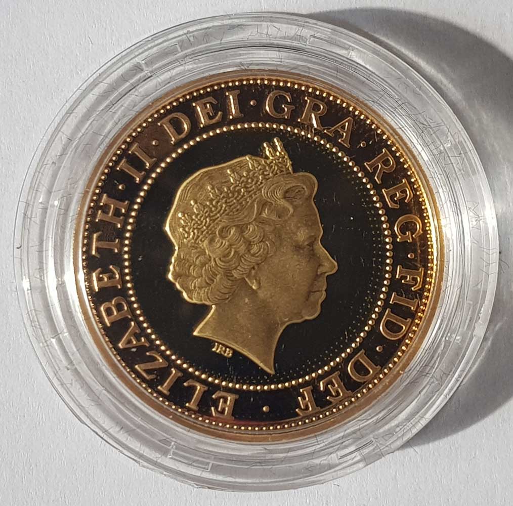 The two pounds piece is made of 22 carat gold (Gold Fineness of 0.916), and weighs 15.98 grams. It has a diameter of 28.40mm. The outer disc is made of ‘red’ gold, with the inner disc being ‘yellow’ gold.