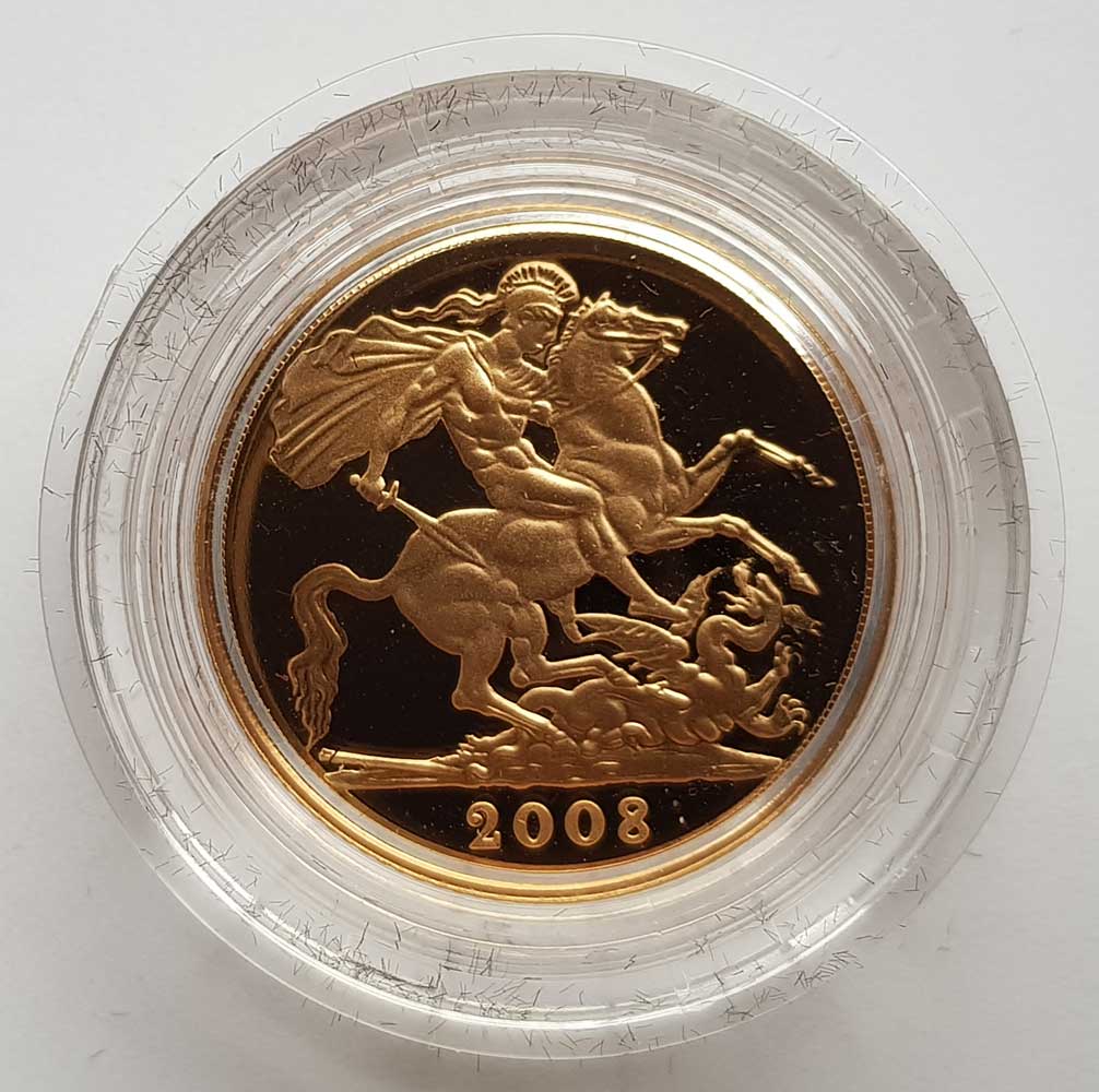 2008 Gold Proof Sovereign Bendetto Pistrucci's famous portrayal of St. George slaying the dragon is depicted on the reverse of the coin. Queen Elizabeth II's fourth portrait can be seen on the obverse, designed by Ian Rank-Broadley. The sovereign is made of 22 carat gold, and weighs 7.98 grams. It contains 0.2354 ounce of fine gold. The 2008 gold proof sovereign is housed in a Royal Mint acrylic screw top capsule, presented in its Royal Mint wooden case with outer black card box, accompanied with an individually numbered certificate of authenticity. Only 12,500 individually boxed proof sovereigns were issued by the Royal Mint in 2008. Looking to SELL GOLD SOVEREIGNS? Please visit our Prices We Pay – Sovereigns Page The first modern gold proof sovereign was issued by the Royal Mint in 1979. Since then, a gold proof sovereign has been issued every year by the Royal Mint. Proof sovereigns are superior in quality compared to standard bullion sovereigns, with highly polished fields, and cameo raised portraits on the obverse and reverse. Gold proof sovereigns are released in a Royal Mint presentation case with a certificate of authenticity. Proof sovereigns often depict Benedetto Pistrucci's famous portrayal of St George and the dragon on the reverse of the coin. The reverse design has been changed several times for special commemorative years, such as the 1989 500th anniversary of the sovereign, and the 2002 Golden Jubilee. M J Hughes Coins are members of the British Numismatic Trade Association – www.bnta.net. We are coin dealers based in Alton, Hampshire (Where we have a shop location). We are always interested in purchasing any coins that you may have for sale, particularly Royal Mint issues and gold coins. We are happy to make no obligation offers, and purchase from a single coin to an entire gold coin collection. You would be more than welcome to visit our shop, or we are happy to travel to you. Please get in contact with us if you would like to discuss further.Summary