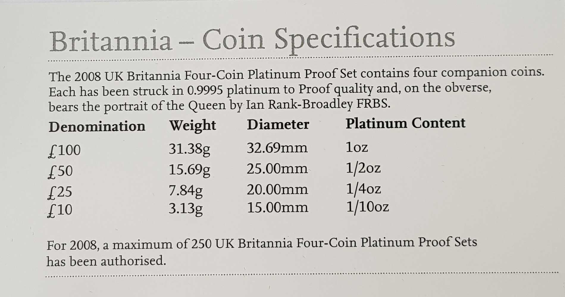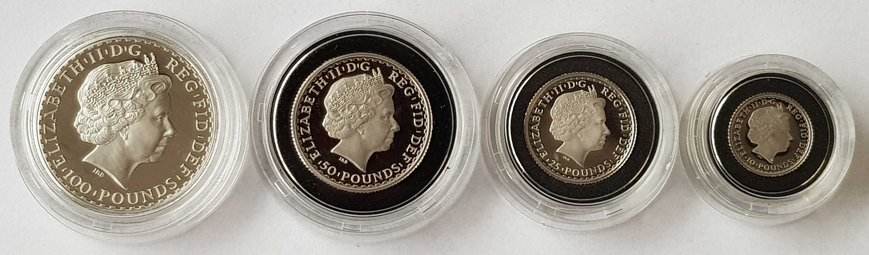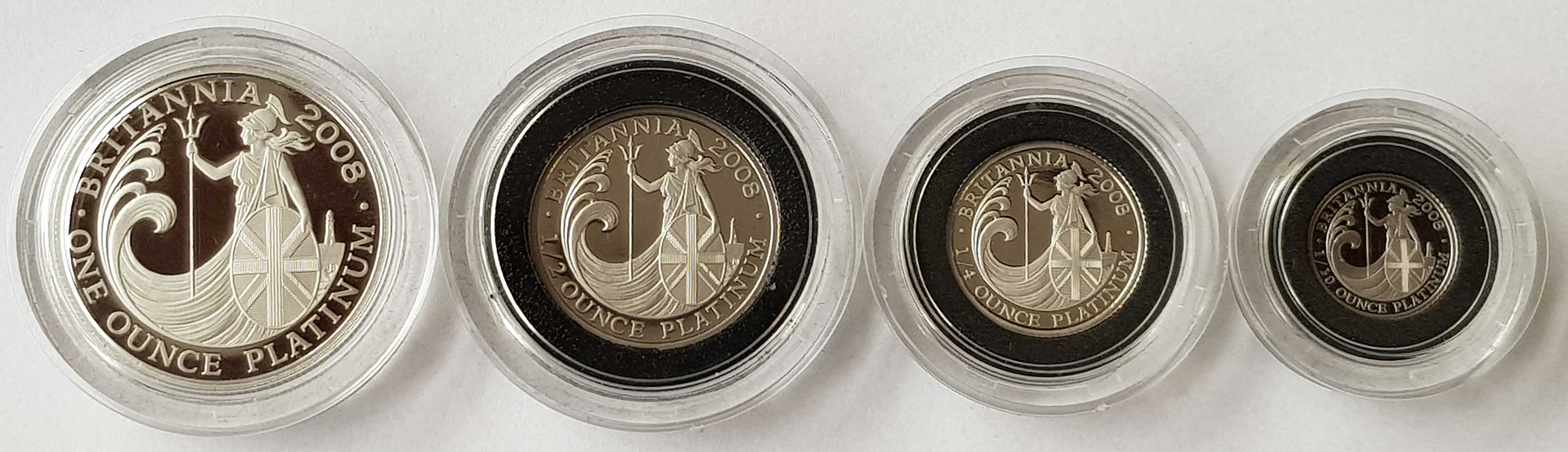 The 4 coin platinum proof Britannia set contains a 1 ounce (£100), 1/2 ounce (£50), 1/4 ounce (£25) and 1/10th ounce (£10.