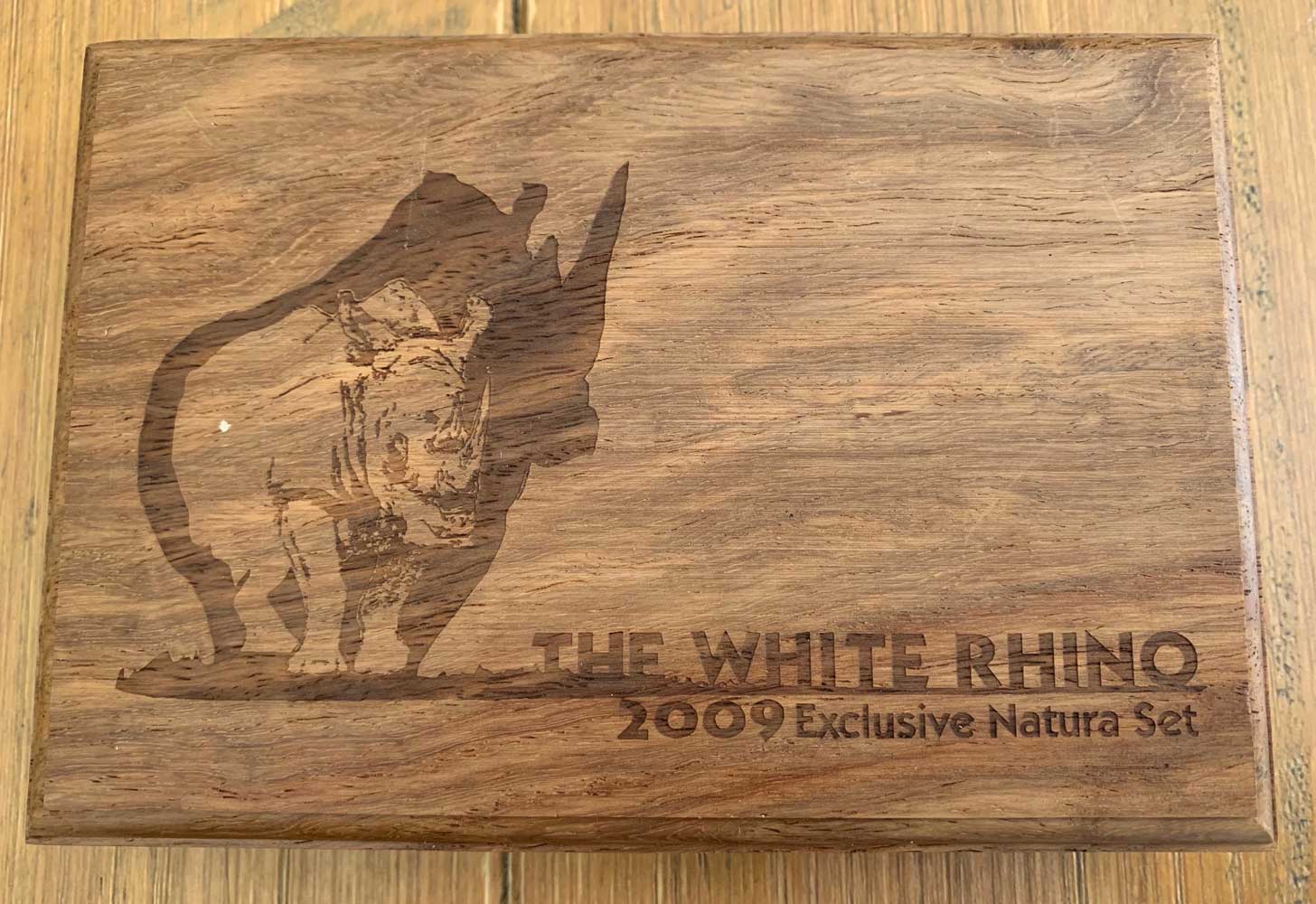 The set contains a gold proof 1 ounce, 1/2 ounce, 1/4 ounce and 1/10th ounce Naturas. The 2009 Natura series depicts the White Rhino. All of the coins are made of 24 carat gold (0.999 fine) The coins are housed in their original SA Mint wooden presentation case, complete with a certificate of authenticity. Accompanying the set is a small silver White Rhino. Only 300 Exclusive Natura sets were issued by the SA Mint in 2009. The Natura gold coin series was first introduced by the SA Mint in 1994. It has since been a popular collecting series, depicting a different animal each year.Summary