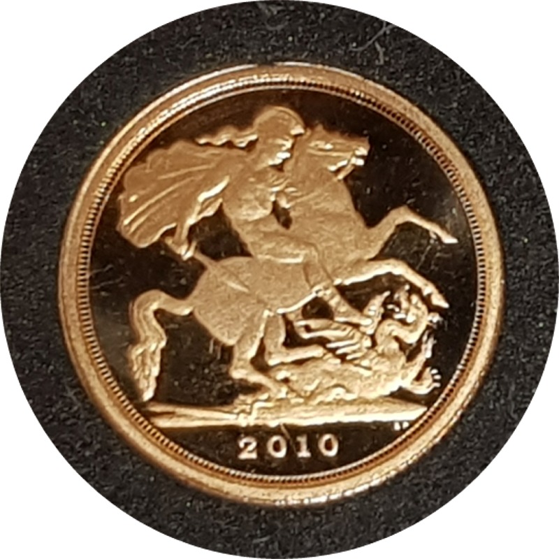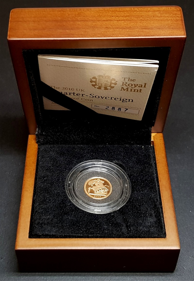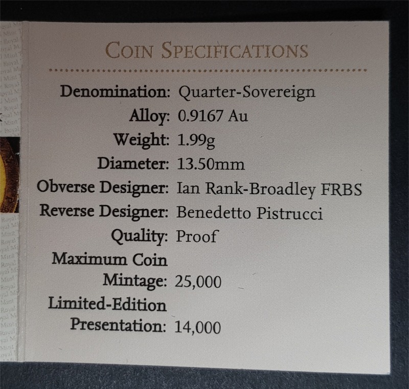 The 2010 Gold Proof Quarter-Sovereign Introduced in 2009, the Gold Quarter-Sovereign is the smallest modern legal tender British gold coin. It is a quarter of the weight of the gold sovereign. Minted at The Royal Mint. The Obverse is the Monarch’s head (Elizabeth II) and the Reverse is Pistrucci's famous St George and the Dragon. Mintage was 25,000 but only 14,000 were issued in this special presentation case. Specifications for the Gold Quarter-Sovereign- Weight: 1.997 g