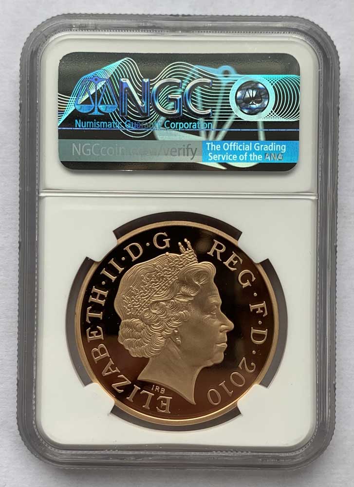 The 2010 Restoration of Monarchy Gold Proof Five Pounds was issued to commemorate the 400th anniversary of the return to monarchy, and the abolition of Oliver Cromwells Commonwealth. The coin has been slabbed and graded by NGC as PR70. The gold proof five pounds is made of 22 carat gold, and weighs 39.94 grams.Summary