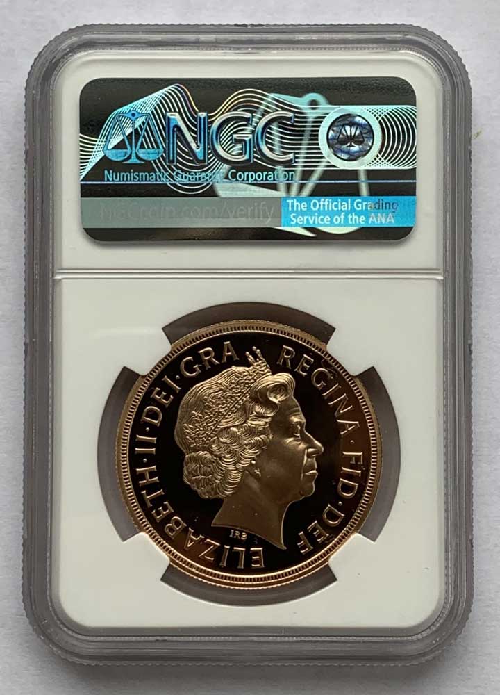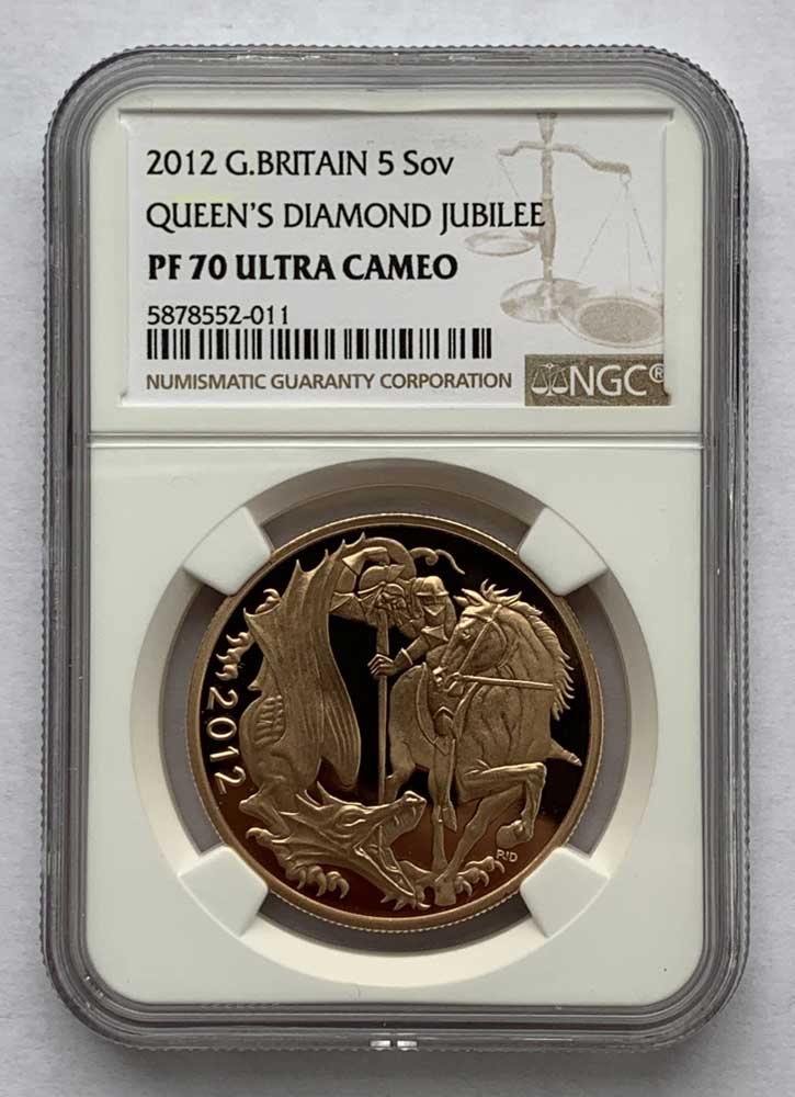 The set contains a 2012 gold proof five pounds, two pounds, sovereign, half sovereign and quarter sovereign. All of the coins have been slabbed and graded by NGC as PR70. The 2012 5 coin gold proof sovereign set features a new portrayal of St George on the reverse of the coins, to commemorate the Diamond Jubilee of Queen Elizabeth II (Designed by Paul Day). The Queens fourth portrait can be seen on the obverses of the coins (Designed by Ian Rank-Broadley). Each coin is made of 22 carat gold. The 2012 5 coin gold proof sovereign set was originally issued with a box and certificate, and had a maximum mintage of 999.Summary