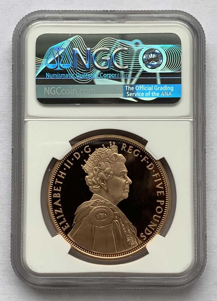 The 2012 Diamond Jubilee Gold Proof Five Pounds was issued to commemorate the Diamond Jubilee of Queen Elizebeth II. The coin has been slabbed and graded by NGC as PR70. The gold proof five pounds is made of 22 carat gold, and weighs 39.94 grams.Summary