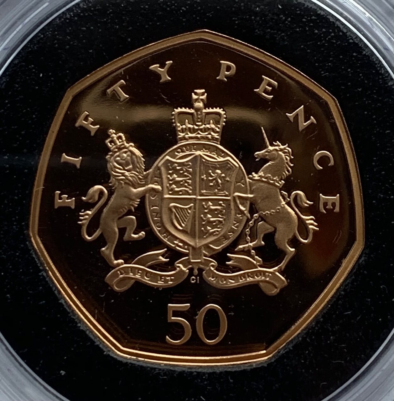 The 2013 Christopher Ironside Gold Proof Fifty Pence features the Royal Coat of Arms on the reverse (Designed by Christopher Ironside), Queen Elizabeth II's fourth portrait can be seen on the obverse (Designed by Ian Rank-Broadley). The gold proof fifty pence is made of 22 carat gold, and weighs 15.5 grams. It comes in its original Royal Mint presentation case, with a certificate of authenticity. The 2013 Christopher Ironside Gold Proof Fifty Pence had a maximum individual mintage of 340, but according to Royal Mint figures, only 198 were produced.Summary