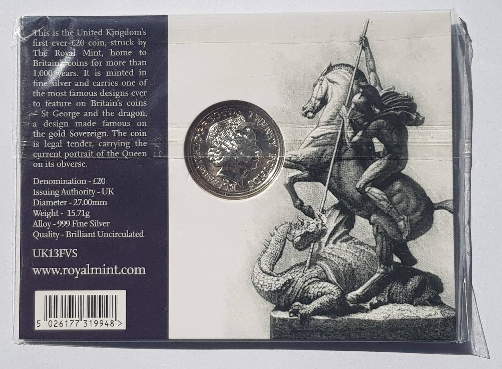 The 2013 St George Silver Twenty Pounds £20 is made of 0.999 fine silver, and weighs 15.71 grams. It has a diameter of 27.00mm. The coin comes sealed in presentation case, as issued by the Royal Mint. Approximately 250,000 pieces were issued. The Royal Mint began issuing the £20 silver coins in 2013, and has released a different design each year. The issue price was £20 (£20 for £20), and initially proved to be very popular with collectors and investors alike. With a legal tender value of £20, many people purchased multiples of the issue. Up until recent years, the coins could be redeemed at high street banks for their face value. Unfortunately, the Royal Mint decided to reject any bank returns, and the coins can no longer be exchanged for currency. With regards to re-sale of the 2013 St George Silver Twenty Pounds £20, the secondary market is now heavily saturated. We are happy to purchase the coins, but at a fraction of their denomination value. We are currently paying £7 each for them, and as you can see, sell them for less than their face value.Summary