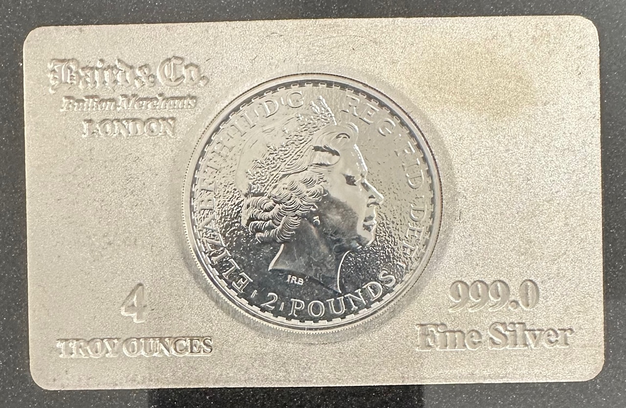 The bar weighs 4oz, and the Britannia coin weighs 1oz, making a total weight of 5oz.