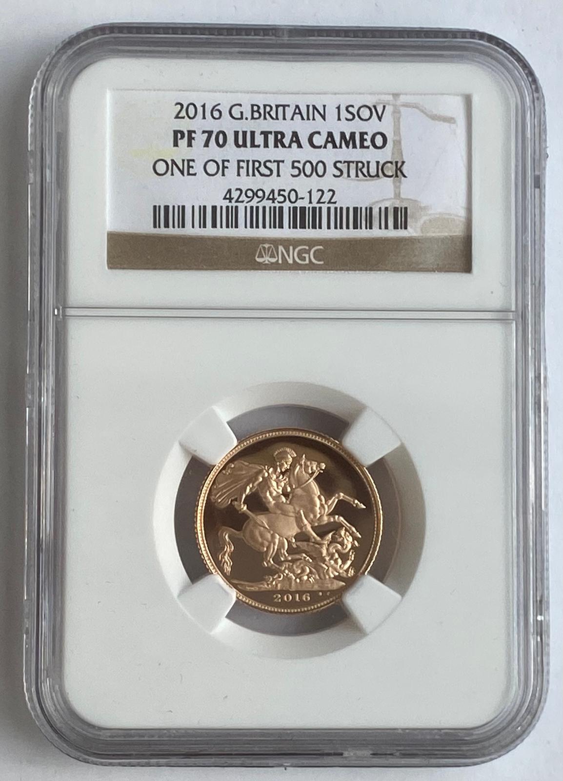 The 2016 gold proof sovereign has been graded by NGC as PF70, One of the First 500 Struck.