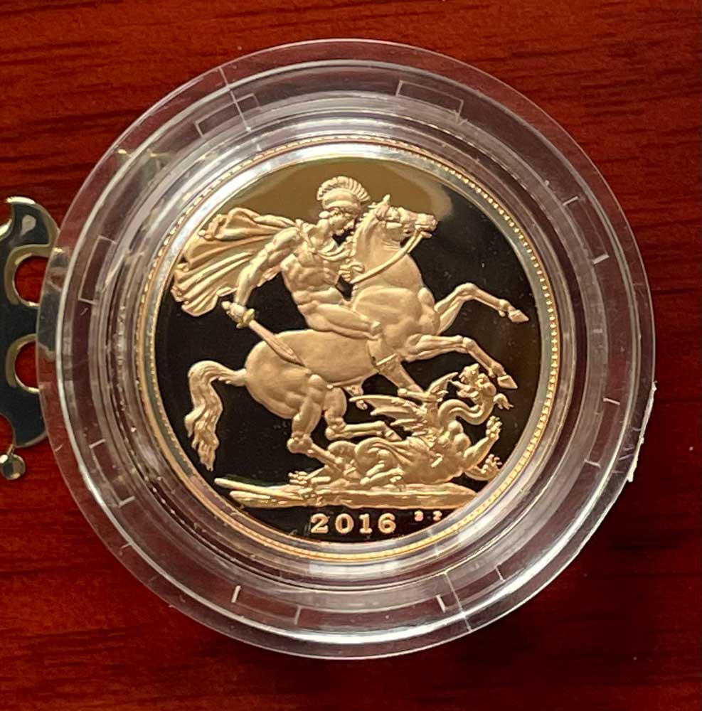 2016 Gold Proof Sovereign Bendetto Pistrucci’s famous portrayal of St. George slaying the dragon is depicted on the reverse of the coin. Queen Elizabeth II’s sixth portrait can be seen on the obverse, designed by James Butler. The sovereign is made of 22 carat gold, and weighs 7.98 grams. It contains 0.2354 ounce of fine gold. The 2016 gold proof sovereign is housed in a Royal Mint acrylic screw top capsule, presented in its Royal Mint wooden case with outer black card box, accompanied with an individually numbered certificate of authenticity. Only 7,500 individually boxed sixth portrait proof sovereigns were issued by the Royal Mint in 2016. Looking to SELL GOLD SOVEREIGNS? Please visit our Prices We Pay – Sovereigns Page The first modern gold proof sovereign was issued by the Royal Mint in 1979. Since then, a gold proof sovereign has been issued every year by the Royal Mint. Proof sovereigns are superior in quality compared to standard bullion sovereigns, with highly polished fields, and cameo raised portraits on the obverse and reverse. Gold proof sovereigns are released in a Royal Mint presentation case with a certificate of authenticity. Proof sovereigns often depict Benedetto Pistrucci’s famous portrayal of St George and the dragon on the reverse of the coin. The reverse design has been changed several times for special commemorative years, such as the 1989 500th anniversary of the sovereign, and the 2002 Golden Jubilee. M J Hughes Coins are members of the British Numismatic Trade Association – www.bnta.net. We are coin dealers based in Alton, Hampshire (Where we have a shop location). We are always interested in purchasing any coins that you may have for sale, particularly Royal Mint issues and gold coins. We are happy to make no obligation offers, and purchase from a single coin to an entire gold coin collection. You would be more than welcome to visit our shop, or we are happy to travel to you. Please get in contact with us if you would like to discuss further.Summary