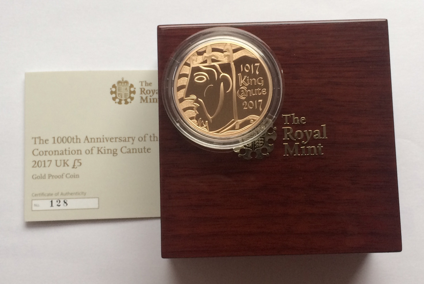 To commemorate the 1000th anniversary of King Canute's ascendance to the English crown, the Royal Mint has struck a new 22 carat gold proof five pounds piece (£5).