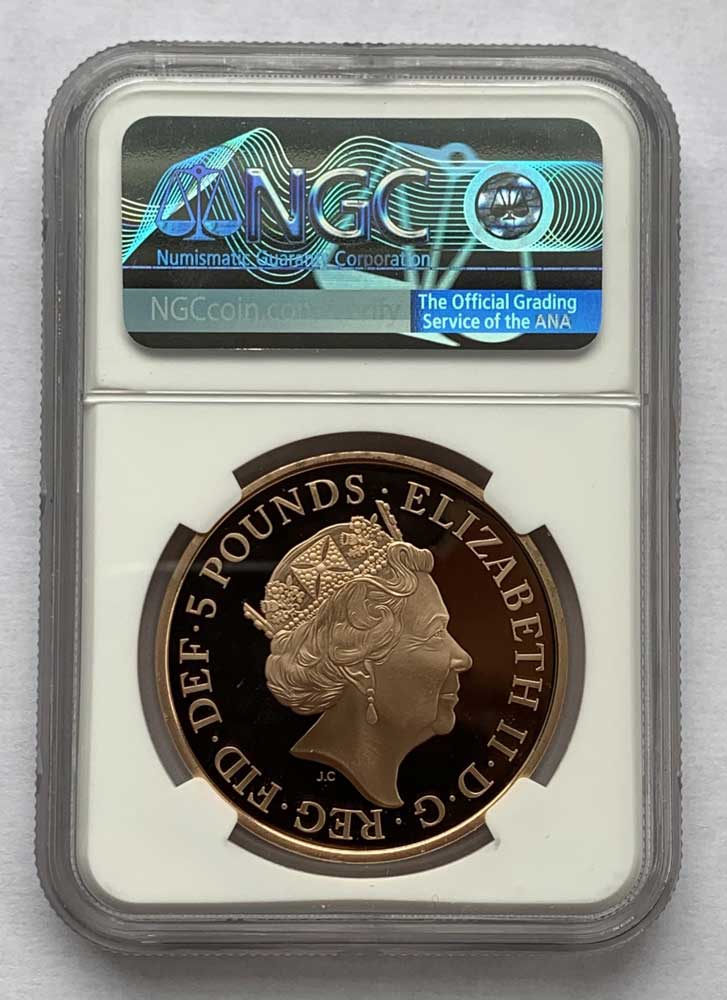 The 2017 House of Windsor Gold Proof Five Pounds was issued to commemorate the centenary of the formation of the Royal House of Windsor. The coin has been slabbed and graded by NGC as PR70. The gold proof five pounds is made of 22 carat gold, and weighs 39.94 grams.Summary