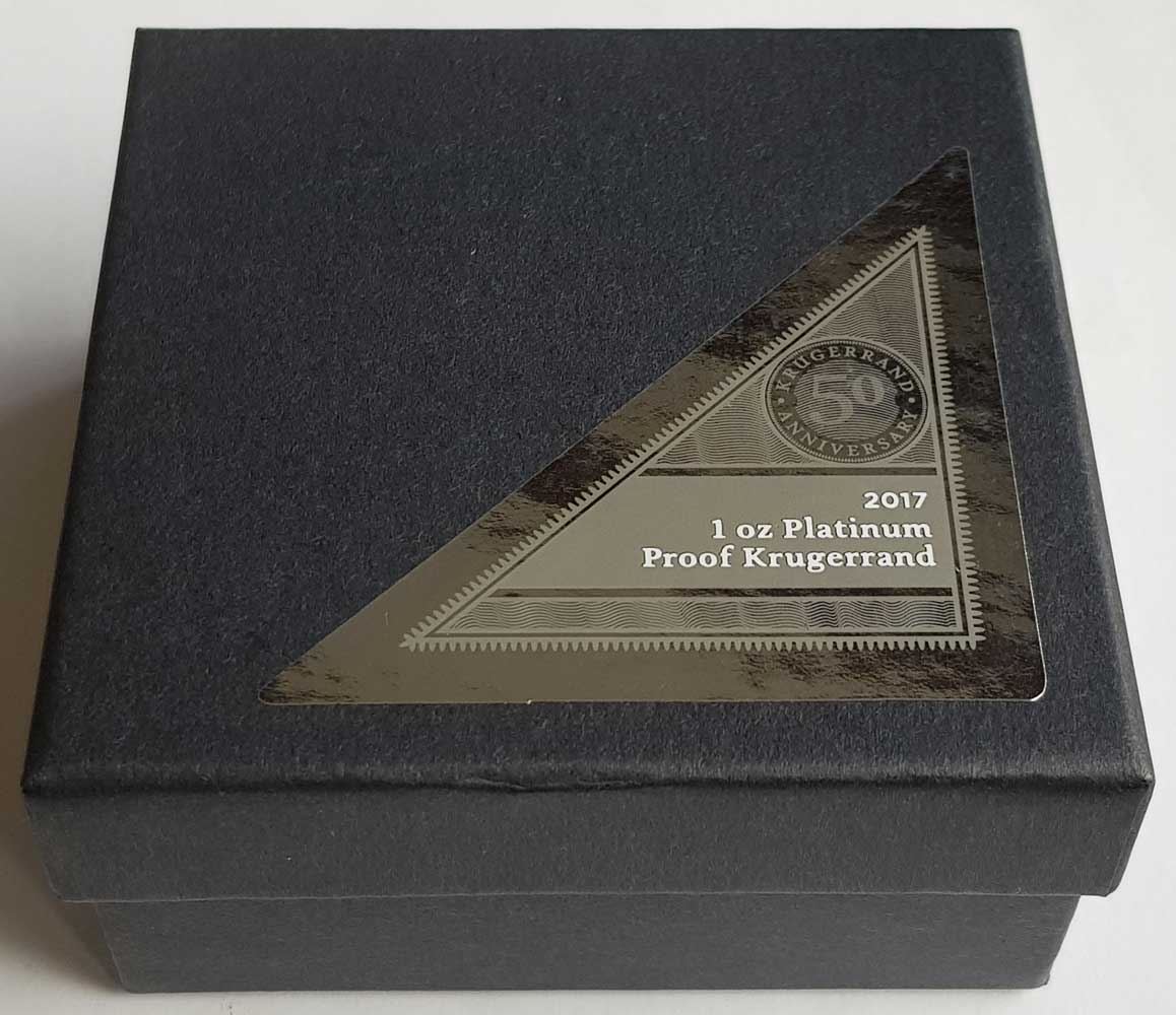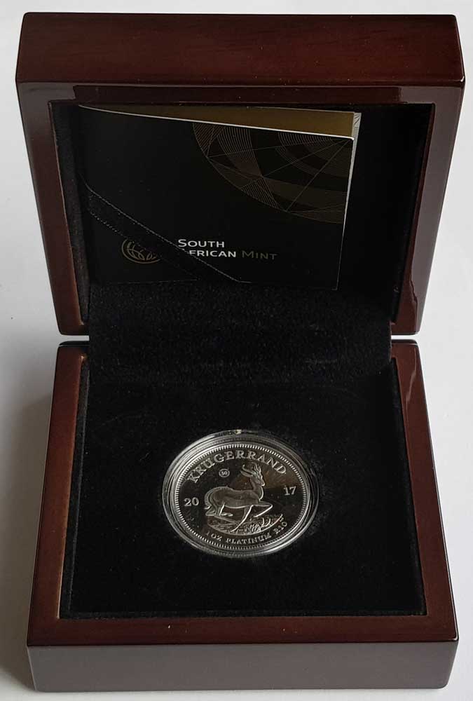 2017 Platinum Proof 1oz Krugerrand. This is the first year a platinum Krugerrand has been issued by the South African Mint. The Krugerrand was issued to commemorate the 50th anniversary of the Krugerrand. The coin comes in its original SA Mint presentation case with a certificate of authenticity. Only 2,017 platinum proof 1oz Krugerrand were produced by the South African Mint.Summary