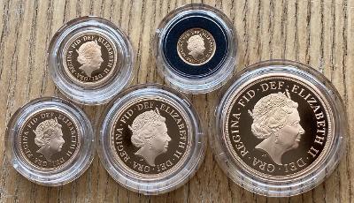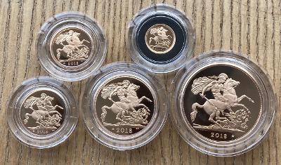 2018 5 Coin Gold Proof Sovereign Set The 2018 5 coin gold proof sovereign set contains a gold proof five pounds piece (£5), two pounds piece (£2), sovereign, half sovereign and quarter sovereign. All 5 coins are made of solid 22 carat gold (0.916 fine). Benedetto Pistrucci's famous portrayal of St George and the dragon can be seen on the reverses. Queen Elizabeth II’s portrait features on the obverses of all 5 coins. To commemorate the 65th anniversary of the coronation of Queen Elizabeth II, a small mint mark can be seen next to the date. The coins come housed in their original Royal Mint wooden presentation case, complete with outer card box and sleeve. Accompanying the set is a numbered certificate of authenticity, as well as an information booklet. Only 750 2018 5 coin gold proof sovereign set were issued by the Royal Mint.Summary