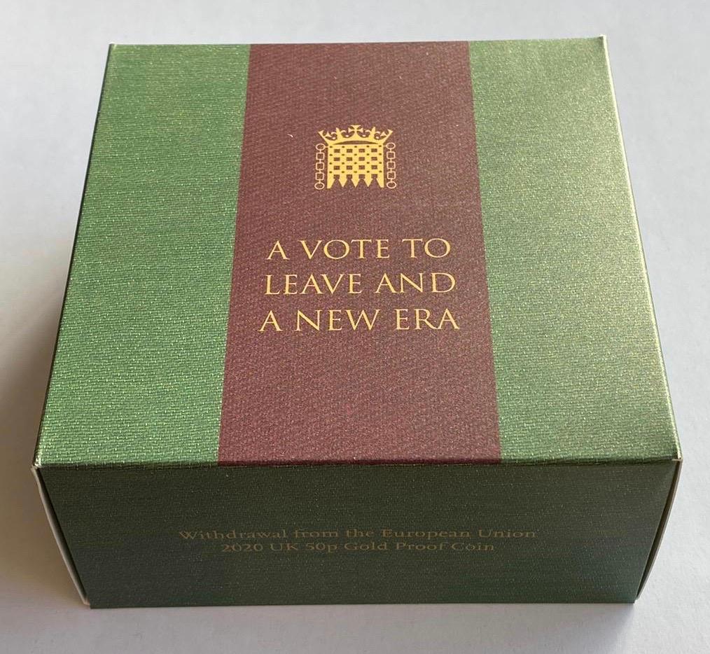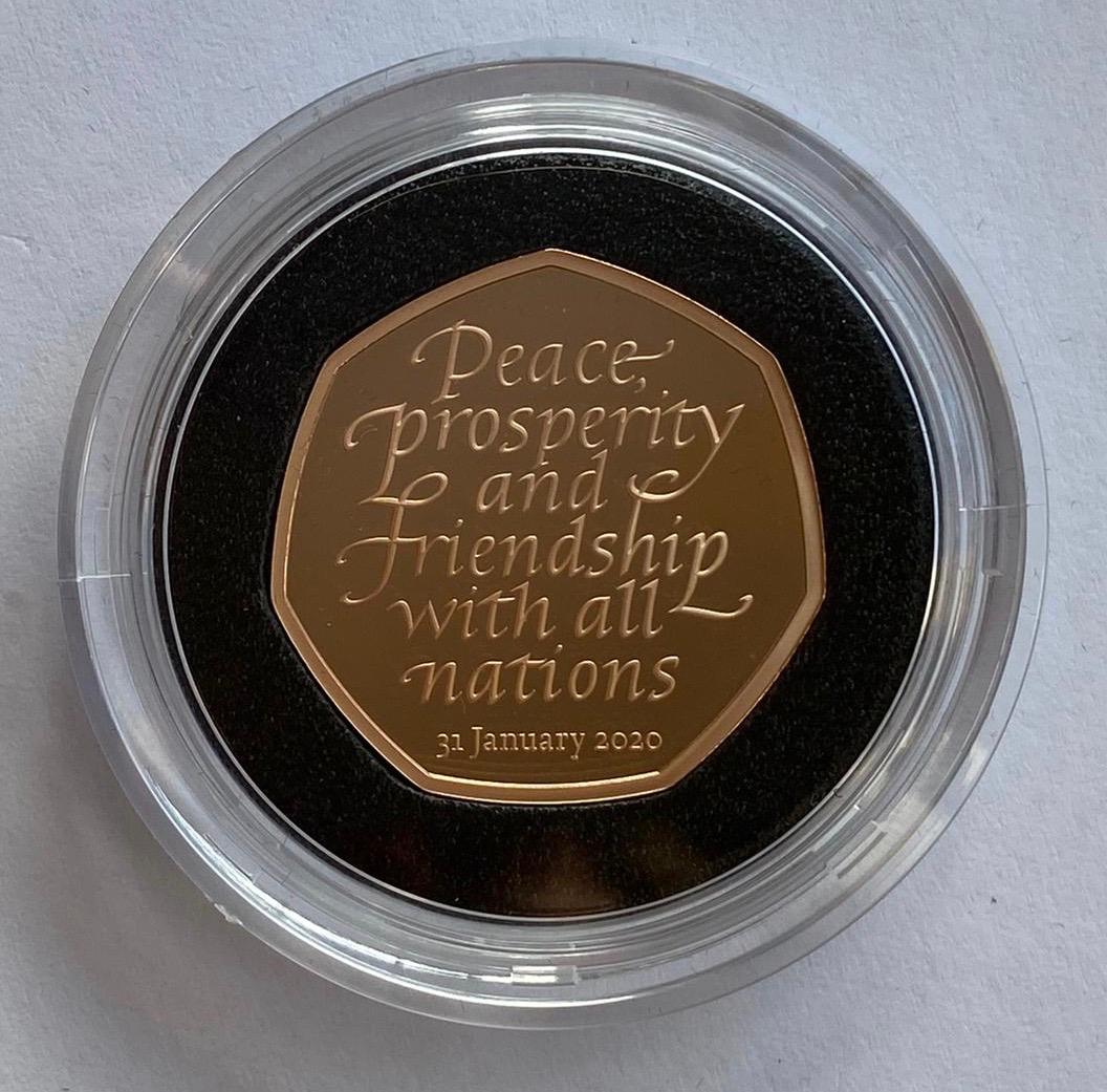 The gold proof fifty pence piece commemorates the UK leaving the European Union.