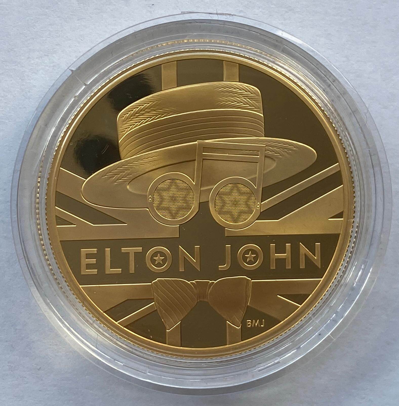 The solo artist Elton John features on the second of the ‘Music Legends’ issue. A design by Bradley Morgan Johnson depicts Elton John in a hat, bow tie with notation glasses. Jody Clarks fifth head portrayal of Queen Elizabeth can be seen on the obverse of the coin. The £200 piece is made of 24 carat gold (0.999 fine) and weighs 62.2 grams. The coin comes in its original presentation box, complete with outer card sleeve and certificate of authenticity. Only 50 pieces were issued by the Royal Mint. The coin sold out within a few hours! The Royal Mint has issued a range of coins with the design, including a gold proof one kilo coin, gold proof one ounce, gold proof quarter ounce, silver proof two ounce, silver proof one ounce and a number of cupro nickel coin packs.Summary