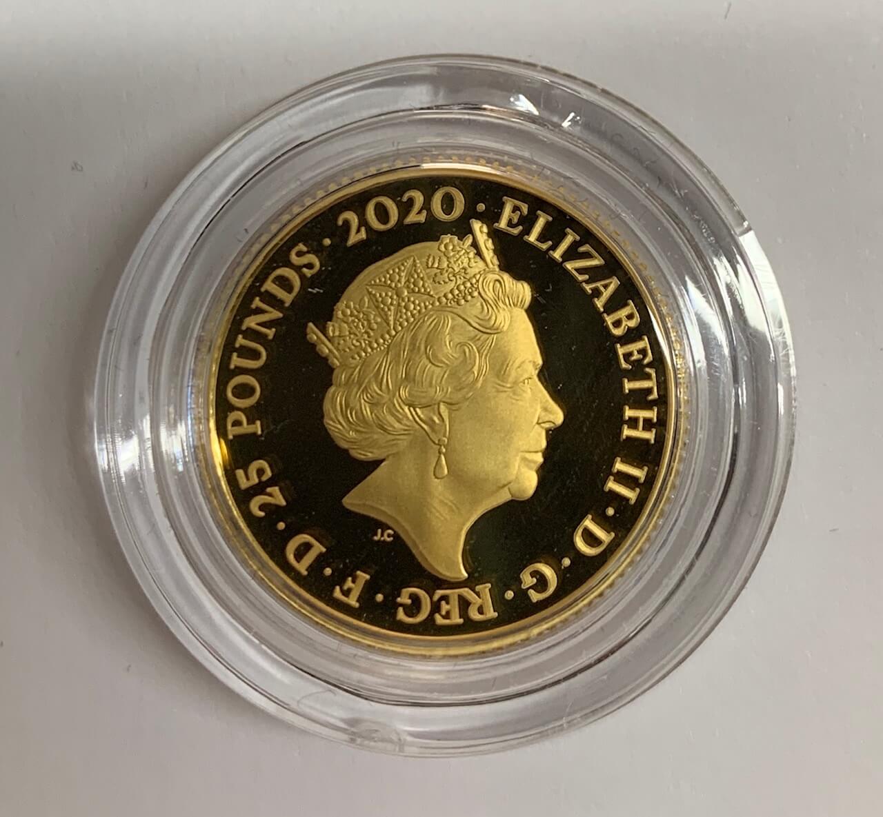 The coin is the first issue of a series of three to be released by the Royal Mint as part of the James Bond range. The reverse design depicts James Bond’s Aston Martin, engraved by Christian Davies and Matt Dent. Jody Clarks fifth head portrayal of Queen Elizabeth can be seen on the obverse of the coin. The £25 piece is made of 24 carat gold (0.999 fine) and weighs 7.78 grams. The coin comes in its original presentation box, complete with outer card sleeve and certificate of authenticity. Only 1000 pieces were issued by the Royal Mint. The Royal Mint has issued a range of gold proof and silver proof coins with the design, most notably the worlds first seven kilo gold proof coin. The piece has a face value of £7,000, unique with a mintage of one.Summary