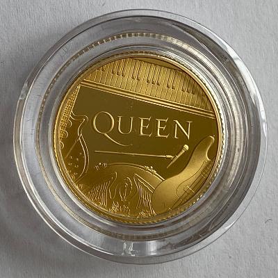 The rock band Queen feature on the first of the 'Rock star' issue. A design by Chris Facey depicts a number of muscial instruments, with the bank name at the centre. Jody Clarks fifth head portrayal of Queen Elizabeth can be seen on the obverse of the coin. The £25 piece is made of 24 carat gold (0.999 fine) and weighs 7.78 grams. The coin comes in its original presentation box, and certificate of authenticity. Only 1000 pieces were issued by the Royal Mint. The coin sold out within a few hours! The Royal Mint has issued a range of coins with the design, including a gold proof one kilo coin, gold proof two ounce, gold proof one ounce, silver proof two ounce, silver proof one ounce and a number of cupro nickel coin packs.Summary