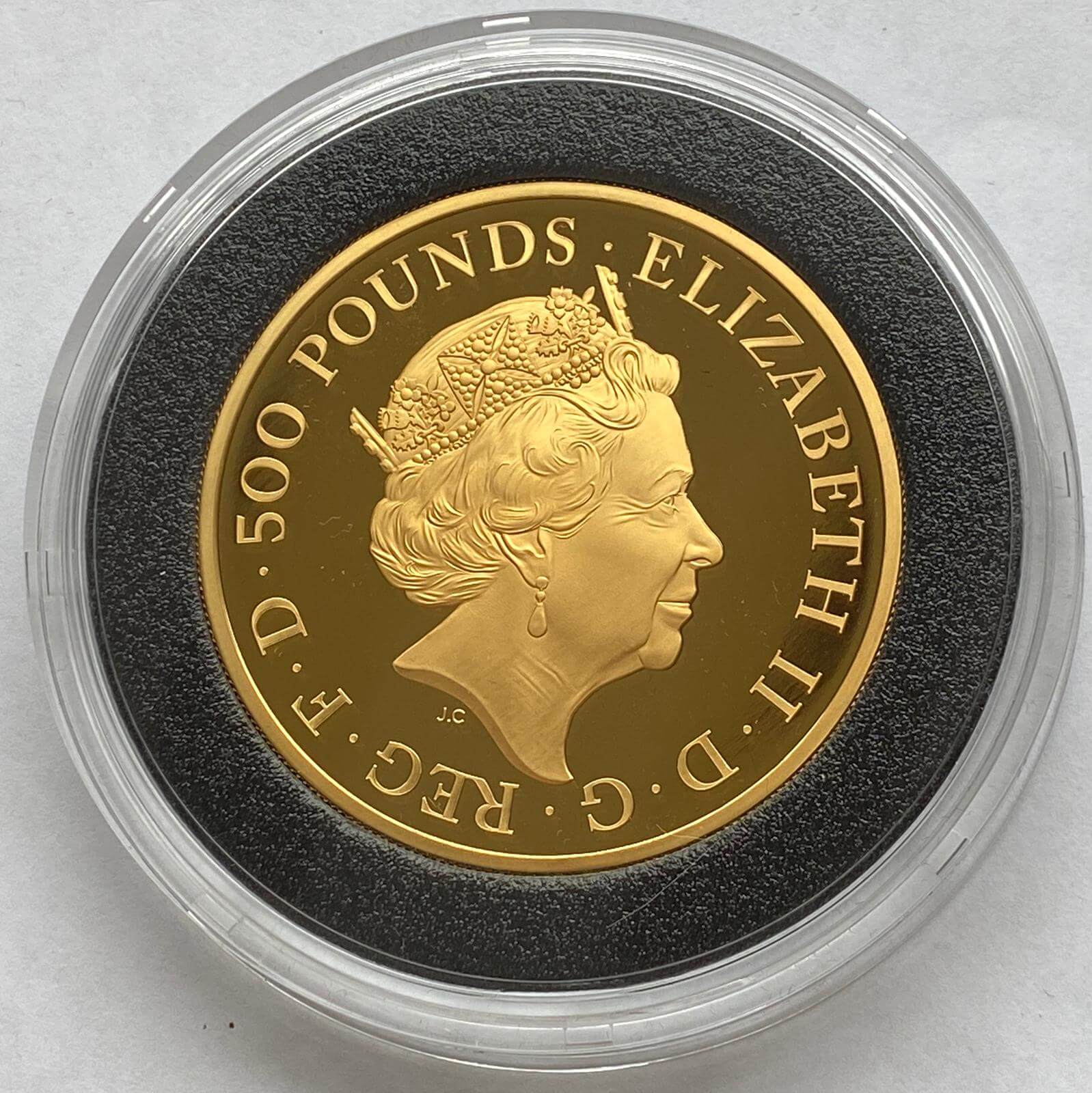The ninth design to be issued as part of the Queens Beasts series, the reverse of the coin features the White Greyhound of Richmond. Queen Elizabeth II's fifth portrait can be seen on the obverse of the coin, both designed by Jody Clark. The £500 piece is made of 24 carat gold (0.999 fine) and weighs 155.5 grams. The coin comes in its original presentation box, complete with outer card sleeve and certificate of authenticity. Only 69 pieces were issued by the Royal Mint. The coin sold out within a few hours!Summary