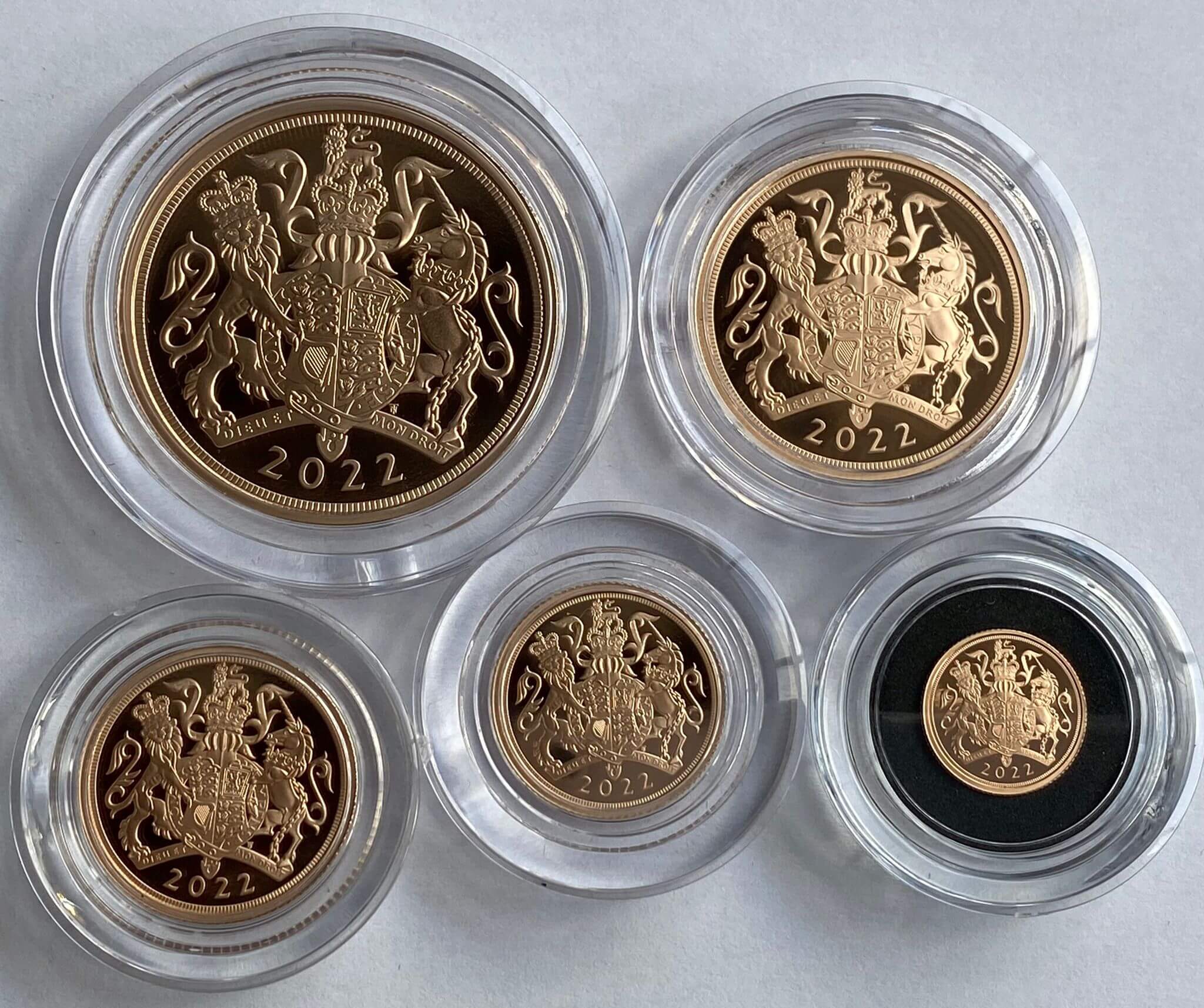 The 2022 5 coin gold proof sovereign set contains a gold proof five pounds (£5), two pounds (£2), sovereign, half sovereign and quarter sovereign. The 2022 sovereign series features a new reverse design to commemorate Queen Elizabeth II's Platinum Jubilee. A Royal Coat of Arms was created by Timothy Noad, the artist behind the 2005 gold proof sovereign depiction of St George and the Dragon. Queen Elizabeth II's fifth portrait can be seen on the obverse of the coins, designed by Jody Clark. The reverse design of the sovereign has only been changed a handful of times by the Mint - 1989, 2002, 2005, 2012 and 2017. All of these dates are extremely sought after by collectors. The 2022 5 coin gold proof sovereign set comes in its original Royal Mint presentation case with a certificate of authenticity. Only 750 sets have been issued by the Royal Mint.